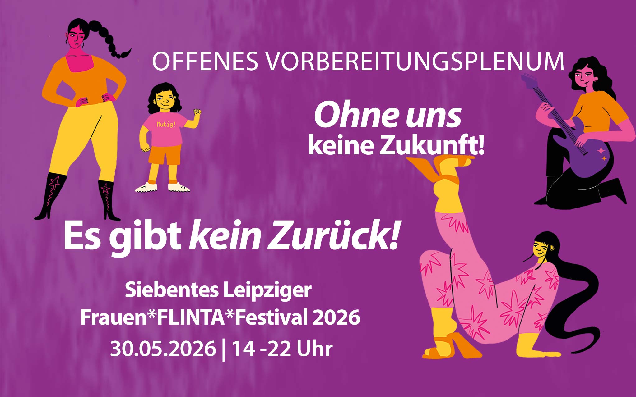 Am 30.05.2026 ist geplant auf dem Marktplatz in der Leipziger Innenstadt das Siebente Leipziger Frauen*/FLINTA Festival unter dem Thema „Es gibt kein Zurück! Ohne uns keine Zukunft!“ durchzuführen. Kooperation von: Frauenkultur Leipzig, Louise-Otto-Peters-Gesellschaft, Werk 2, Lebenszeiten und engagierte Einzelne.
