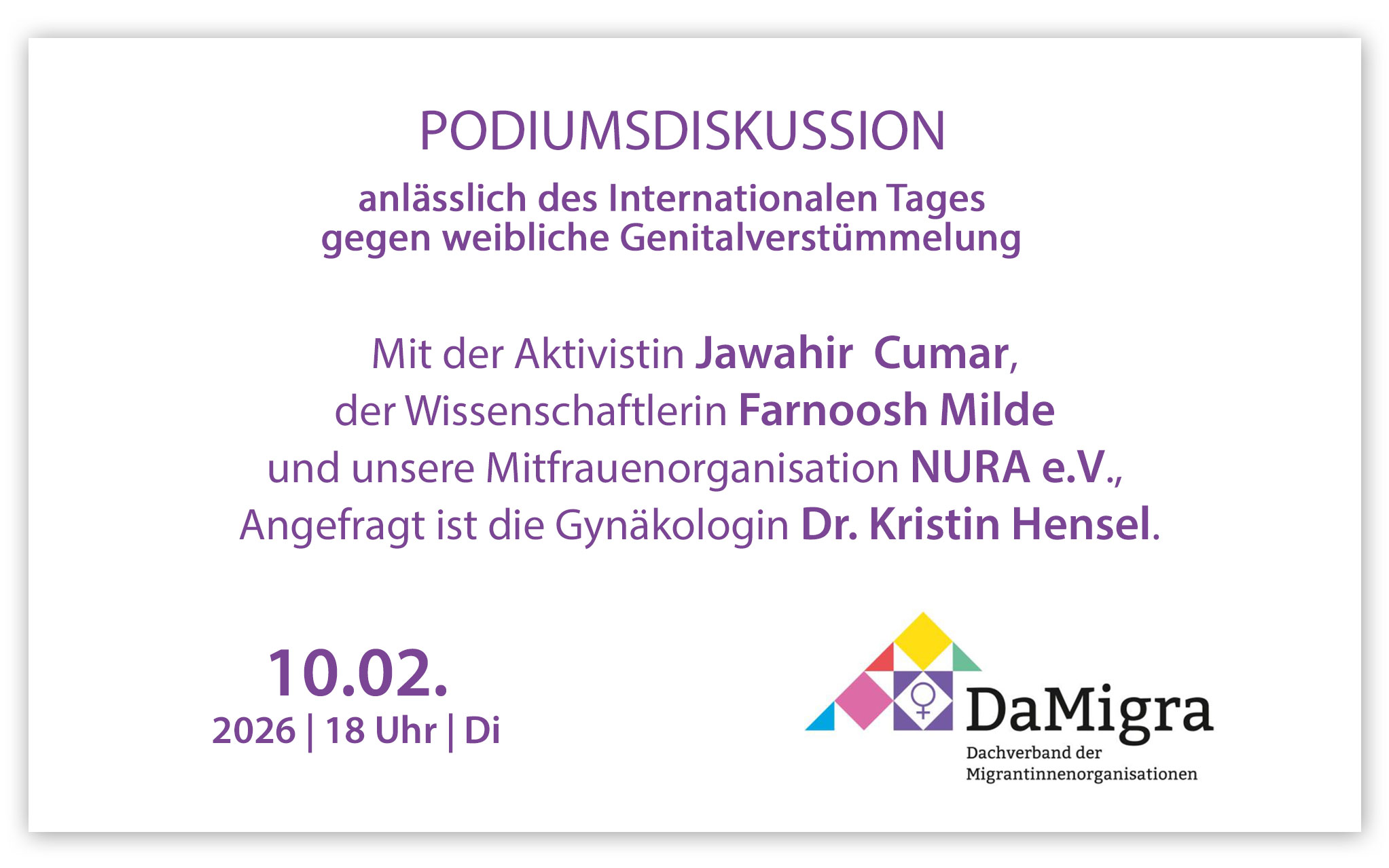 Mit dabei sind die Aktivistin Jawahir Cumar, die Wissenschaftlerin Farnoosh Milde und unsere Mitfrauenorganisation NURA e.V., angefragt ist zudem die Gynäkologin Dr. Kristin Hensel.