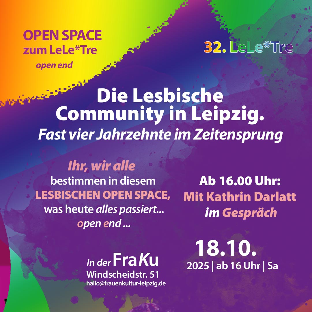 Zum 32. Leipziger Lesben*Treffen wollen wir alle einladen, die Lesbische Community in Leipzig in ihrer Wichtigkeit, in ihrer Bedeutung, in ihrer Einmaligkeit … und natürlich in ihrer Widerstandsfähigkeit über vier Jahrzehnte in unserem Lele*Tre-Open-Space zu feiern. Für jeden OPEN-SPACE charakteristisch: Die inhaltliche Offenheit.