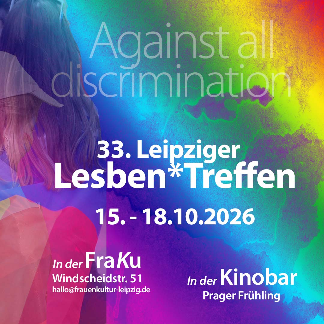 Das „Leipziger Lesben*Treffen“ wird auch in seiner 33. Ausgabe mit viel Leidenschaft, Ernsthaftigkeit & konsequenter Positioniertheit – unterschiedlichsten Perspektiven auf die queer-lesbische Community einen offenen Raum geben. Das ist heute letztendlich für ein geschlechtergerechtes Miteinander-Leben-Wollen unabdingbar. Und wie in den vergangenen Jahren werden aktuelle gesellschaftliche Herausforderungen und Konflikte, die 2026 unser aller Alltags-/Leben mehr als nur tangieren – unumgänglich lesbische Teilhabe in der Gegenwart wie in der Vergangenheit berühren und Einfluss nehmen.