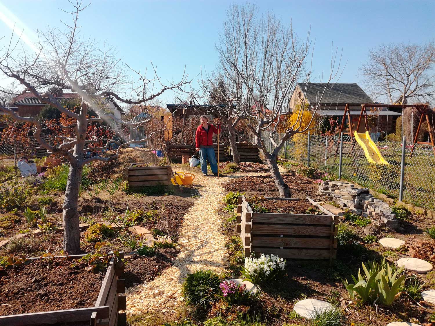 Das sind Bilder von Baumscheiben. Ich habe in meinem Garten drei alte Apfelbäume stehen, die lebten da, als ich den Garten übernommen habe. Da er vorher fast drei Jahre unbenutzt und nicht gepflegt war, waren die ganzen Flächen total verwildert. Ich habe von einer Baustelle Steine bekommen, die sonst entsorgt worden wären und habe die Fläche um die Bäume kreisrund gestaltet. Es war erst mal wirklich als Gestaltungselement gedacht, da der Garten eine rechteckige Form hat. Im Laufe des letzten Jahres habe ich aber begonnen, die Baumscheiben gezielt zu nutzen. In einem sind verschiedene Kräuter angepflanzt, in einem anderen habe ich Phaselia, Bienenfreundin, ausgesät und unter meinem dritten Baum ist ein Schicht-Mulchbeet entstanden, einfach in dem ich letzten Herbst beim Garteneinsatz Blätter gesammelt habe und unter den Baum geschüttet….jetzt kommt da der Samen von Kapuziener-Kresse und andere schöne Sachen hinein, so dass ich die Fläche auch nutzen kann …