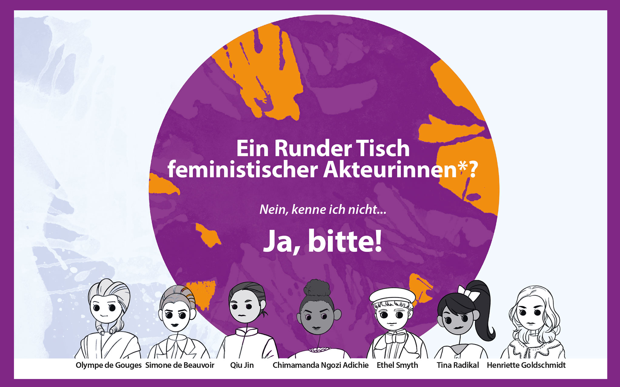 Olympe de Gouges, Qiu Jin, Henriette Goldschmidt, Ethel Smyth, Simone de Beauvoir, Chimamanda Ngozi Adichie, Tina Radikal & Lea Cheri … im virtuell-fiktionalen Tischgespräch.