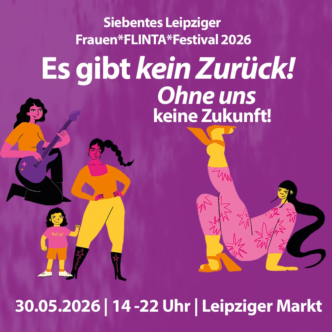 Am 30.05.2026 ist geplant auf dem Marktplatz in der Leipziger Innenstadt das Siebente Leipziger Frauen*/FLINTA Festival unter dem Thema „Es gibt kein Zurück! Ohne uns keine Zukunft!“ durchzuführen. Kooperation von: Frauenkultur Leipzig, Louise-Otto-Peters-Gesellschaft, Werk 2, Lebenszeiten und engagierte Einzelne.