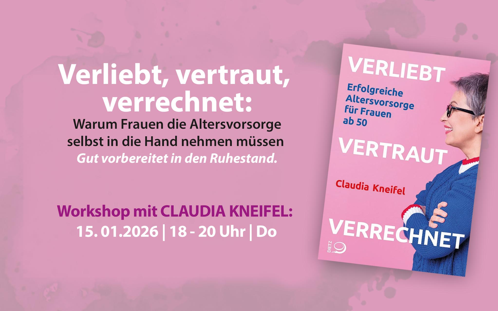 CLAUDIA KNEIFEL, Redakteurin bei der Main-Post, hat sich diesem Thema eingehend gewidmet. In diesem Workshop und in ihrem gleichnamigen Buch zeigt sie praxisnah, wie Frauen aller Altersstufen ihre Zukunft selbstbestimmt gestalten können – Schritt für Schritt, ohne Stress. Finanzplanung ist keine Männersache und kann sogar Freude machen! Claudia Kneifel bringt ihre langjährige Erfahrung und viele hilfreiche Tipps mit – und motiviert dazu, den ersten Schritt zu wagen. Denn: Es ist nie zu spät, sich um die eigenen Finanzen zu kümmern.