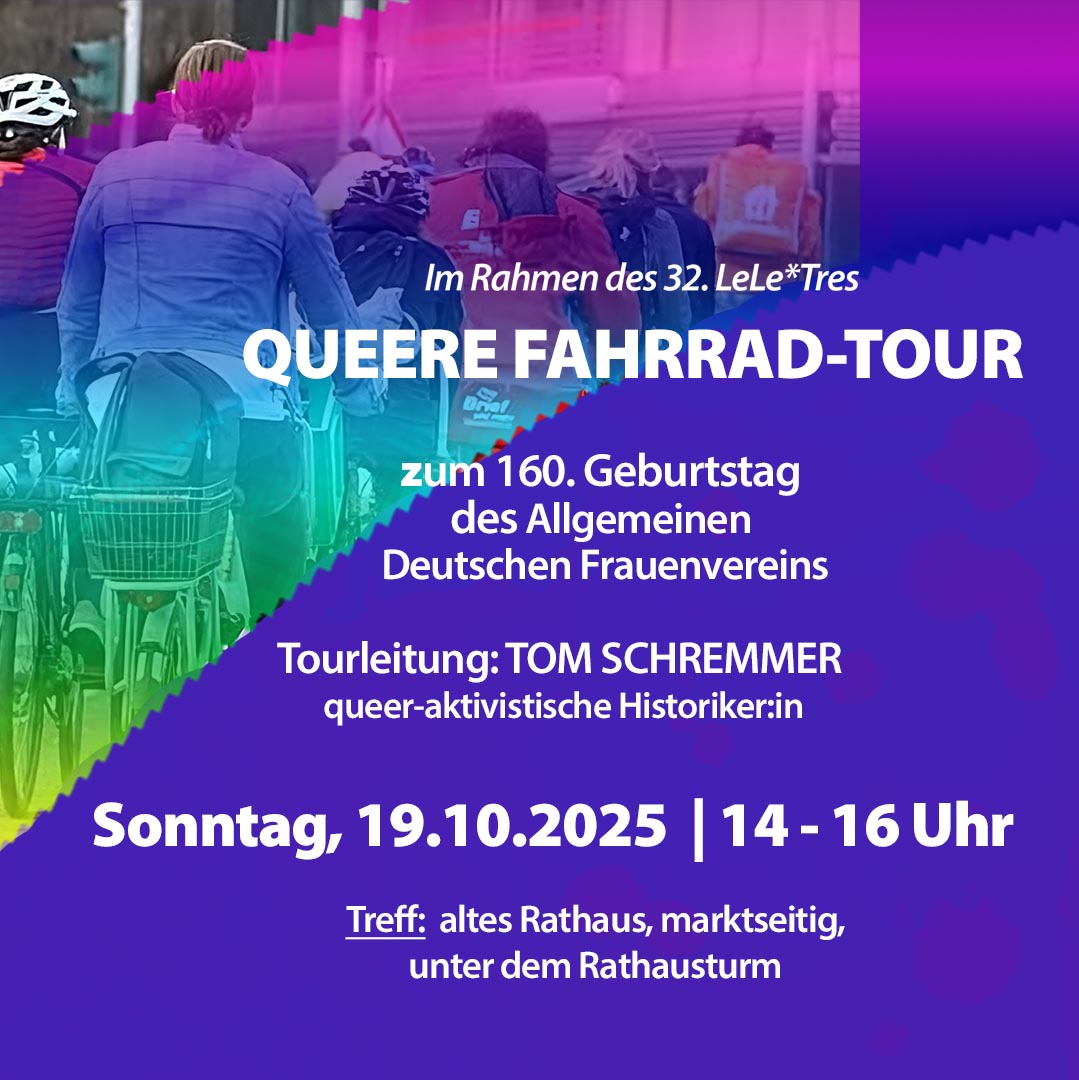 Wir laden euch ein zu dieser herbstlichen queer-feministischen Fahrradtour. Anlass ist der 160. Geburtstag des Allgemeinen Deutschen Frauenvereins in Leipzig und damit dem Beginn der feministischen Bewegung in Deutschland… und wir fahren natürlich am Gründungsort vorbei. Auch der Standort des ersten deutschen Verlags für queere Literatur und der geplante Standort des Leipziger Denkmals für die Frauenbewegung, gehören zur Tour.