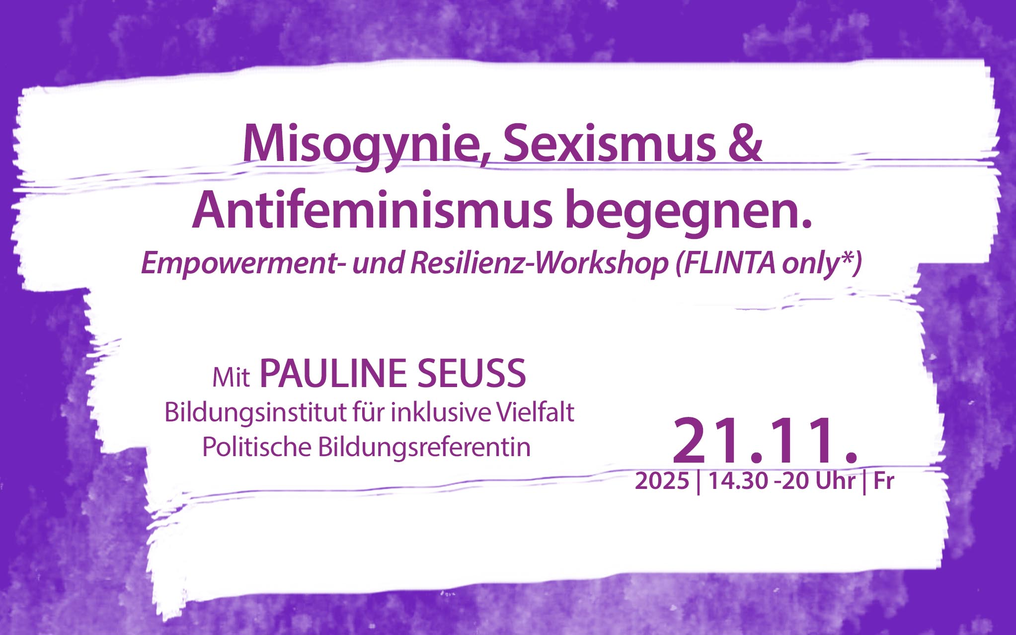 *FLINTA steht für Frauen, lesbische Personen, inter Personen, nicht binäre Personen, trans Personen & agender Personen. Der Raum des Workshops steht darüber hinaus auch allen Menschen offen, die sich nicht in dieser Bezeichnung wiederfinden; sich als queer identifizieren.